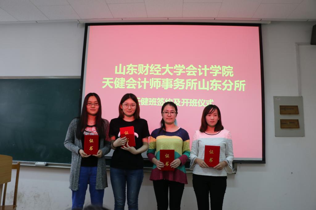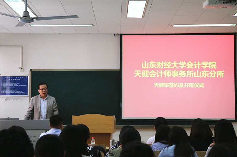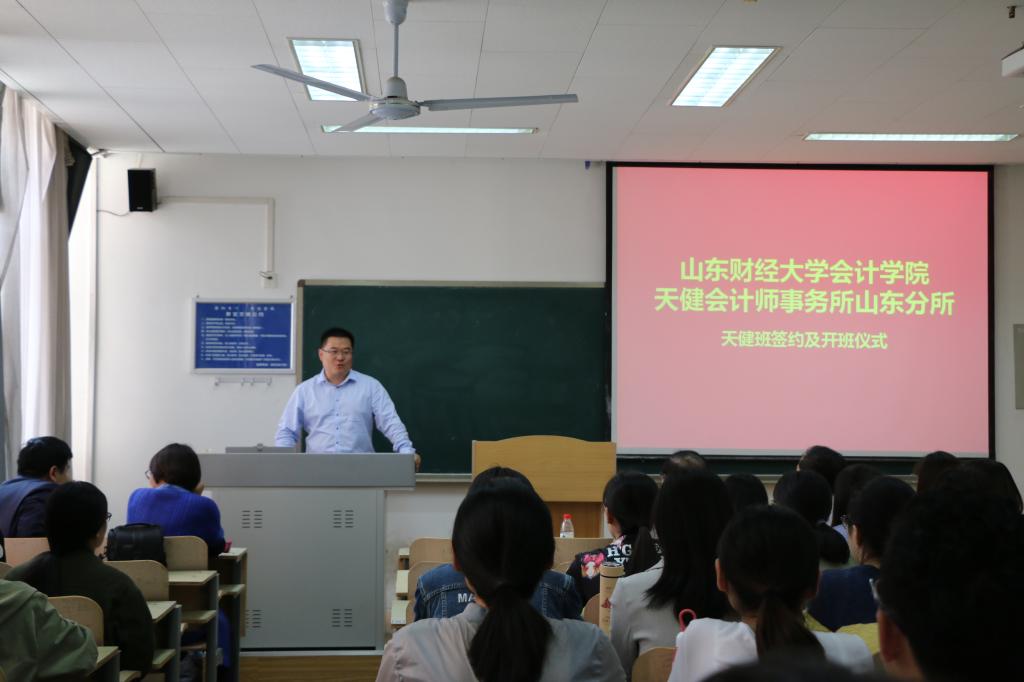 5月4日,注册送彩金 天健会计师事务所山东分所天健班签约及开班仪式在燕山校区逸夫楼108教室隆重举行。天健会计师事务所高级合伙人、山东分所总经理刘加宝,副总经理韩炳海,注册送彩金 党委书记张涛、副院长孙文刚等出席了本次仪式,入选天健班的40位同学共同参加。