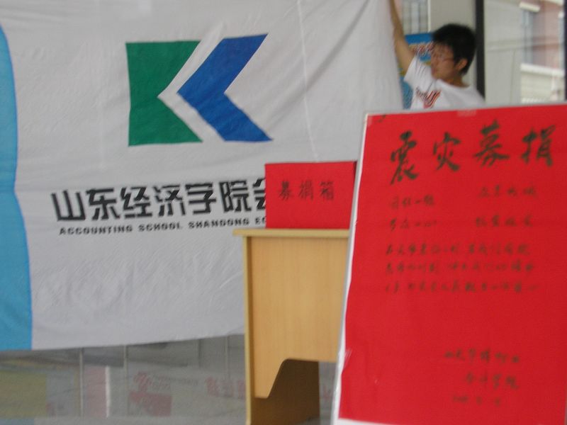 活动在明水校区凯旋门举行。得到了全校广大师生的积极响应。我校广大师生充分发扬“一方有难,八方支援”的中华民族传统美德,纷纷伸出援助之手,积极向灾区人民奉献爱心。小小的募捐箱前人流络绎不绝,老师,学生,物业的叔叔阿姨……不管大家放进去的是多少钱,但大家都只有一个念头——让灾区人民尽快脱离危险,度过难关。“一颗爱心就可能救助一位处于风雨之中的四川灾民,让他们看到生的希望!我希望大家都能伸出的双手,献出我们的爱心。我相信四川汶川县人民一定会战胜这次地震带来的困难,重新建立起美好的家园!”一位捐款的同学说。
