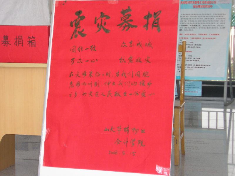 学生会联合华特物业面向全校师生发起了爱心捐款活动。发生在四川汶川的7.8级强烈地震牵动着全国千千万万民众的心,此次活动为我们提供了一个向受灾群众表达爱心,传递力量的途径。