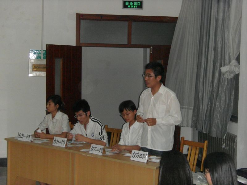 决赛的辩题为“奥运礼仪服饰更应体现民族化还是更应追求国际化”,正反方辩手分别来自会本0701、会本0704和会本0702、会本0703。在双方一辩的慷慨陈词为各自树立核心论点后,双方进入公辩环节。反方辩手面对正方的攻击表现的沉着冷静,转守为攻;正方辩手亦针锋相对,步步为营。双方坚守自己的阵地,抛“玉”引玉,有理有据,共同为观众献上了一场精彩激烈的辩论赛。