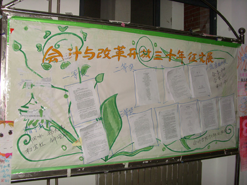 注册送彩金 积极响应主办单位号召,动员全体学生踊跃参与到活动中。在注册送彩金 领导、老师的鼓励和指导下,以平日所学,结合多部会计学文献,以及通过咨询会计行内人士,撰写了多篇优秀文章。截止到九月底共收到论文、诗歌等各类稿件1000余份。其中,07级会计本科三班金宝坤同学撰写的《会计人员眼中的改革与演变》获得本次比赛的一等奖。该同学积极与当地多家银行(如建设银行,人民银行)的会计人员进行交流调查,经过总结概括,对会计的演变、进步以及新会计准则的实施等方面做出了独到的见解,并对会计的未来做出了展望;审计0701的赵杰以及会计本科0704的沈龙瑜同学则以诗歌的形式对会计在改革开放三十年的发展历程进行了讴歌描述,获得本次比赛的二等奖。同学们还匠心独运,以剧本、故事的体裁描述了会计在此三十年走过的风风雨雨。经过评议小组的一致评定,共评选出一等奖两篇,二等奖三篇,三等奖五篇。成果一展板形式展出。