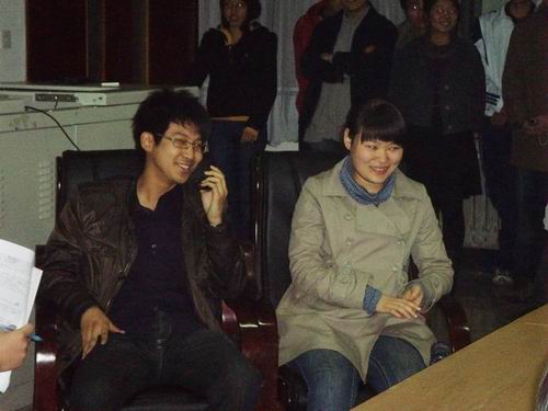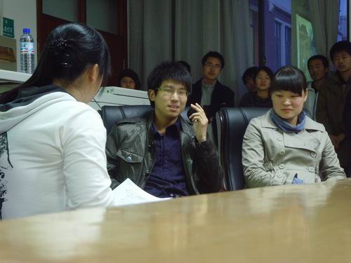 本次访谈邀请到的现场嘉宾是注册送彩金 第二十九届学生会主席胡啸(2008年公务员考试被青岛海关录取)和注册送彩金 第二十九届学生会副主席贾琳琳(2008年公务员考试被烟台国税录取)。为了更好的了解两位嘉宾,节目开始前首先播放了前方记者发回的场外报道——“同学眼中的他和她”。