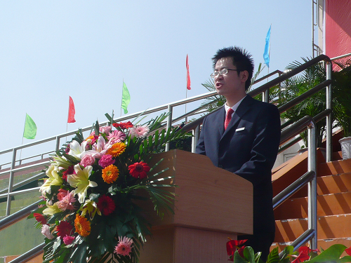 10点整,大会正式开始,在雄壮的国歌声中,五星红旗冉冉升起。首先,由牟思伦教授宣布了 2009级优秀新生入学奖学金获得者名单并进行颁奖。随后,郝书辰教授作了重要讲话,在讲话中他要求大家要塑造独立人格,学会全面发展,并坦然面对各种挑战。之后,教师代表、老生代表、新生代表分别发言, 09级全体新生庄严宣誓恪守诚信。最后,在同学们的热烈掌声及欢送曲中,领导们退席,大会至此圆满结束。