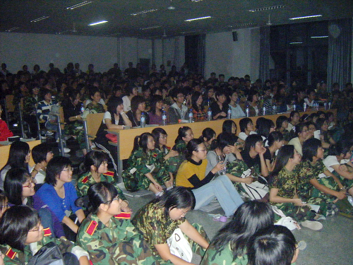 新生举办的生活学习经验交流会在明水校区4101教室拉开序幕。身着绿军装的新生们早早地来到活动现场,现场座无虚席。注册送彩金