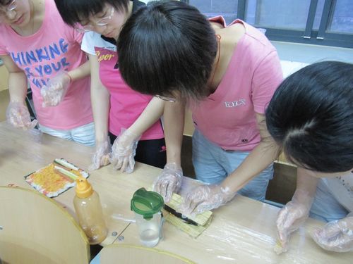 此次活动主要通过寿司达人现场教授的方式,向大家传授寿司的制作方法及要领。首先将现场同学分为五组,并向每个小组分发了制作工具及必备材料。随后,在寿司达人的亲授下,同学们依据流程全身心地投入到自己的寿司制作中。压米饭、摆放材料、卷海苔,各小组成员分工明确,彼此协商合作互相帮助,经过了一番努力,一盘盘精致诱人的寿司便呈现在了大家眼前。看着自己的劳动成果,同学们都很兴奋,争相给作品拍照,又互相品尝。温馨而又有意义的活动在大家的欢声笑语中结束。