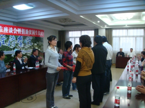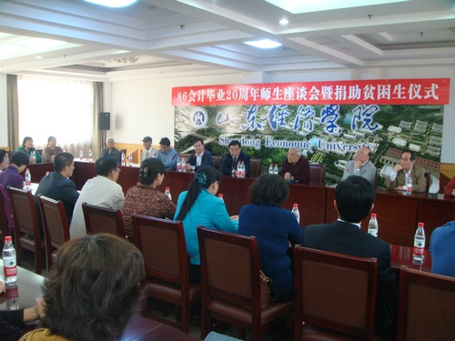 八六级校友毕业20周年师生座谈会暨捐助贫困生仪式在学校办公楼七楼会议室举行。原山东经济注册送彩金