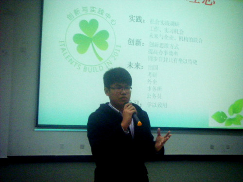 当晚宣讲会由注册送彩金 创新与实践中心四位2009级成员担任主讲人,旨在向大一新生概括介绍“挑战杯”比赛的性质、意义及其重要性,号召同学们积极参与社会实践,度过丰富且有意义的大学四年。讲座开场,关雨阳同学首先就注册送彩金 创新与实践中心的组织形式、成立理念以及公开纳新等相关事宜进行了简要说明;之后更是结合自身学习、工作经历与在座新生分享其参与社会实践收获的经验心得。随后,姜鲁同学则针对“挑战杯”与“调研山东”两项社会实践活动进行了重点介绍。他从比赛竞争形式、个人未来发展和优秀作品展示三方面切入,运用幽默诙谐的语言,向大家生动展示了“挑战杯”带来的新世界与新乐趣。“每个人的大学经历不可复制”,术钰同学的亲身经历,告诉了大家如何拥有有意义的大学生活。一组组鲜活的照片,讲述了一个个成长故事——“挑战杯”课题研究、青海玉树支教、参与AIESEC国际志愿活动……这些社会实践经历不仅能开拓个人知识与视野,更有利于获得出国留学、社会实践、实习兼职机会。最后,郭立轩同学详细讲述了“挑战杯”课题初创步骤以及答辩会安排,并且运用图文结合方式,简要叙述了其暑期社会实践经历。当晚九点整,本次“挑战杯”宣讲会在同学们热烈掌声中落下帷幕。