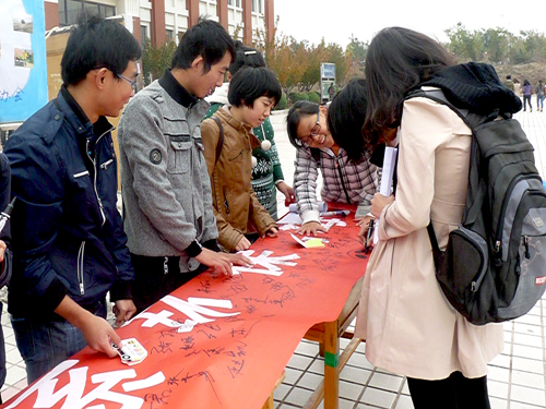 水是维系生命与健康的基本需求,地球虽然有70.8%的面积为水所覆盖,但是淡水资源却极其有限,世界上有超过十亿的人口无法获取足量而且安全的水来维持基本需求。承然环保协会希望以本次活动为契机,将节水习惯渗透到大家日常生活的点滴之中。为了扩大活动覆盖面,协会成员在前期进行了充足的准备,并采取了条幅宣传、网络宣传、海报展示等多种方式对此次活动进行宣传。由于宣传到位,活动一开始便吸引了大批同学的关注。写满节水警语的展板分外醒目,正中央一句“我用生命的全部呵护你,只求你手心刹那的温柔”更是撼动人心,触发了大家对浪费水资源行为的反省。同学们纷纷驻足,在节水横幅上郑重地签下自己的名字,许下一份对节水爱水的承诺。协会成员在为大家详细讲解节水重要性的同时,并向同学们征集了节水标语。据悉,本次活动将持续7天。