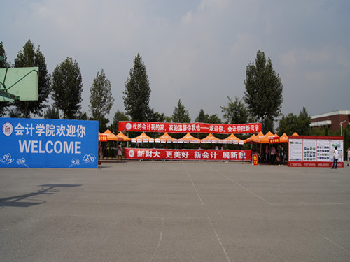 早上六点左右,学生会的工作人员在操场上陆续搭起帐篷,立起贴有《2012级分班情况表》《新生入学指南》《注册送彩金 简介》的展板,挂起印有“新财大 更美好 新会计 展新貌”的横幅,有条不紊地迎接着新生的到来。