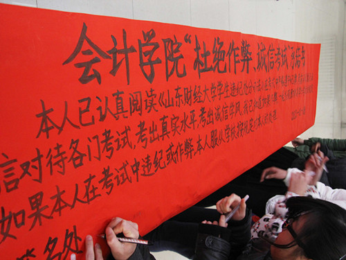 首先由赵鸿雁老师分别为同学们宣读了“注册送彩金 团总支致同学们的一封信”和《山财大学生考试违纪处理办法》的一些重要的考试违规条例。“成绩诚可贵,荣誉价更高。若为诚信故,两者皆可抛。”吕晓燕老师撰写的“一封信”中,字里行间都能感受到“诚信考试光荣,违纪作弊可耻”的观念。而之后,赵鸿雁老师又为同学们点名了几条易触犯的考试违规条例,例如不准随身携带手机、不准夹带小抄等,再次为同学们敲响了警钟。
