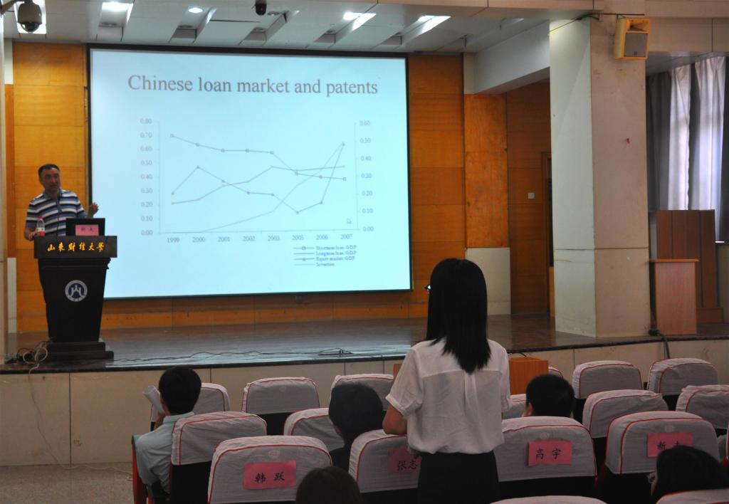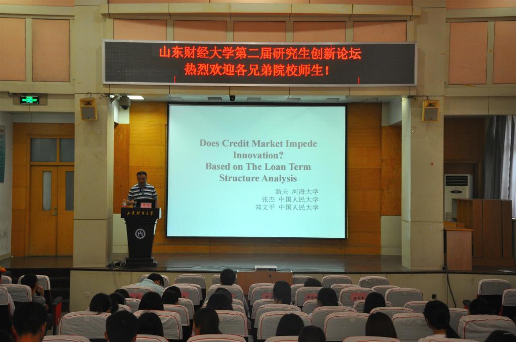 韩跃老师主持。首先,河海大学商学院会计系新夫教授以”Dose credit market impede innovation?Based on The Loan Term Structure Analysis”为题进行了学术报告。新夫教授先就如何选择论文题目与同学们分享了一些自己的观点。他将论文选题角度分为红海和蓝海两个战略,让同学们认真思考是进入竞争激烈的红海还是选取较少有人涉足的蓝海,新夫教授同时也给出了自己在学术研究道路上选择论文题目的一些实践经验。随后新夫教授以中国专利大爆炸为背景向同学们介绍了创新领域的前沿热点问题以及一些有名的学术文章和知名学者,使得在座同学们受益匪浅。现场在座的研究生们就自己感兴趣的方面向新夫教授提出了问题,新夫教授也一一做出了认真详细的回答,并在最后鼓励同学们在自己感兴趣的学术领域深入挖掘下去,争取做出有创新意义的研究成果。