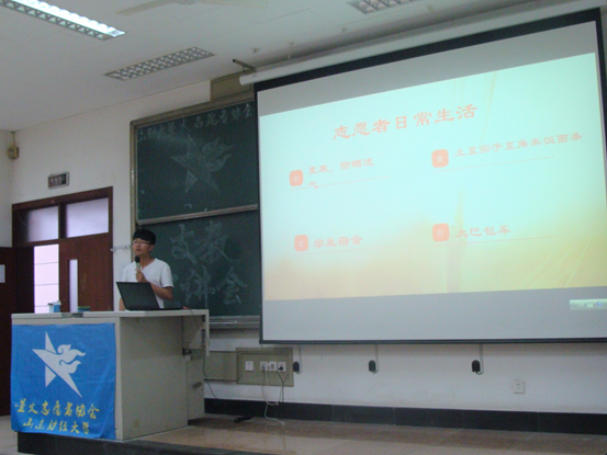 “支教,是神圣又艰苦的活动,但大多数人忘记了支教活动的本质,支教是源于爱,而不是为了锻炼自己、去体验生活”,星火负责人马东飞同学如是说。本次宣讲会,马东飞同学向大家介绍了支教的生活以及支教的感受,他重点强调支教一定是源于自己的爱,而不是些功利的东西。负责人李悦向大家讲解了支教所设科目以及志愿者的选拔要求,她说支教虽苦,但绝无悔意。随后星火成员在现场答疑解惑,在场的同学们都坚定的举手表示自己不惧困苦,希望为支教献出自己的力量。