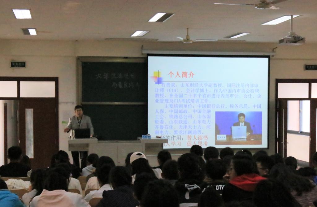 石贵泉老师不仅担任我校注册送彩金 会计信息化系主任,教学经验丰富,更是国际注册内部审计师,山东省财政厅内部控制咨询专家团队成员,全国知名内部审计培训咨询专家,是我校少有的理论教学和实务培训兼优的“双师型”专家。多年来他以会计信息化、内部审计、风险管理和内部控制为主要研究方向,收获颇多。本次讲座他带着自己丰富的阅历与2017级注册送彩金 审计系的新生就“大学生活规划与素质培养”展开了热切的讨论。讲座开始,石贵泉老师对大家进入注册送彩金 学习表达了热情的欢迎,同时他也鼓励同学们要珍惜大学时光,努力奋进!石贵泉老师表示,学习贯穿人的一生并且发挥着极其重要的作用,因此希望大家能明白学习的重要性,树立终生学习观念,多去聆听老师、学姐学长等前辈的建议,少走弯路,吸取经验,认真规划人生,不负青春!