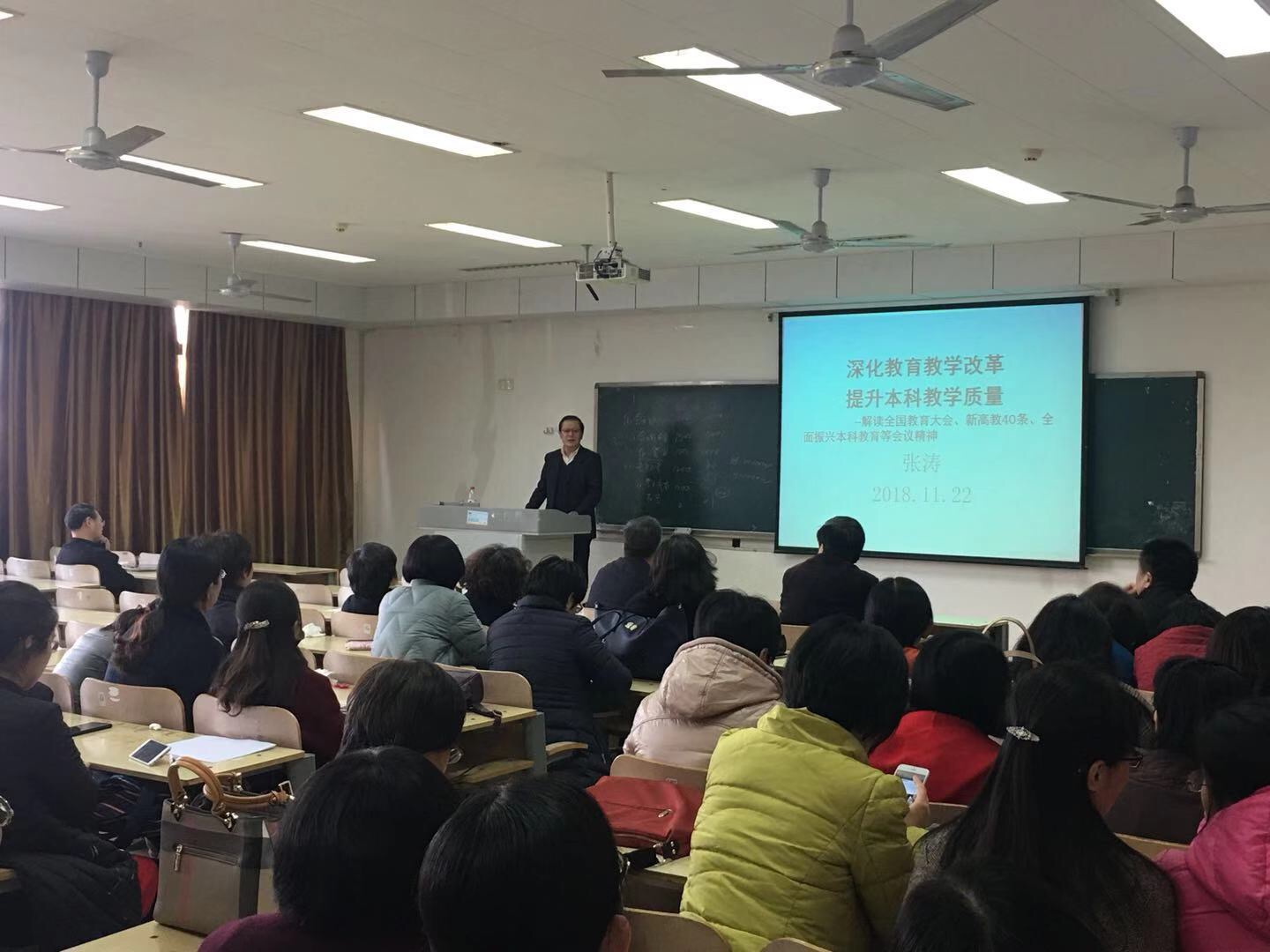 11月22日下午,注册送彩金 召开全体教职工大会,注册送彩金 党委书记张涛做了题为“深化教育教学改革、提升本科教学质量”的报告,解读全国教育大会精神、学习教育部全国高等学校本科教育工作会议以及新高教40条,分析当前本科教育形势、畅谈高等教育“创新”理念。