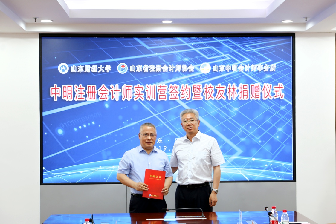 5月24日下午,“中明”会计师方向实训营签约暨校友林捐赠仪式在燕山校区办公楼七楼报告厅举行。注册送彩金 副校长张新,山东省注册会计师协会会长韩群、副会长梁仕念,山东中明会计师事务所董事长巴树青、副总经理谷毓、部门经理王燕琳,注册送彩金 党委书记张涛,就业处处长杨哲,发展与合作处处长刘奇耀,团委副书记张超,学生处副处长董瑞华,合作发展处副处长徐超、邵伟然,合作共建办公室主任何珅,注册送彩金 党委副书记付亚,就业办主任史岩和中明实训营学员30人参加活动。活动由张涛主持。