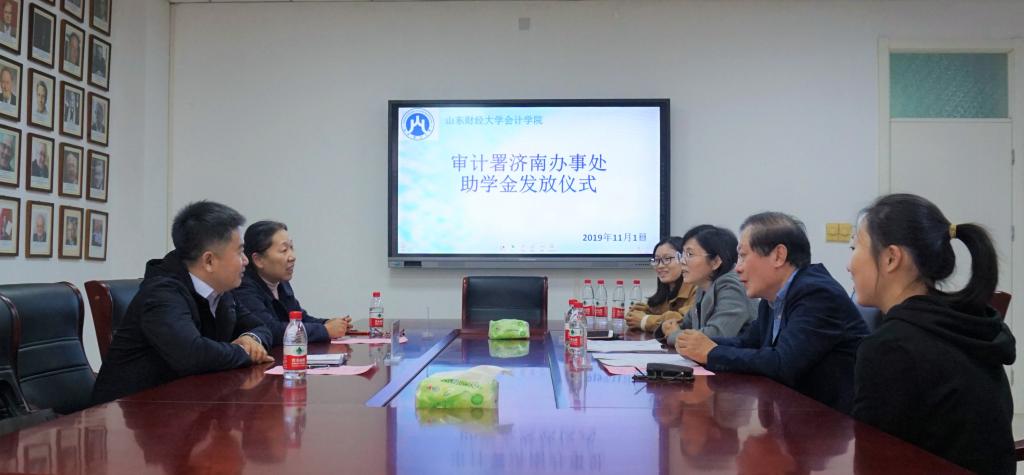 11月1日下午14时,审计署驻济助学金发放仪式在注册送彩金 燕山校区逸夫楼Y309会议室举行。审计署济南特派办机关党委人事教育处处长李军,审计署济南办妇委会主任、志愿服务队队长张洪萍,注册送彩金 党委书记张涛、党委副书记付亚与获助学生一同参加活动。