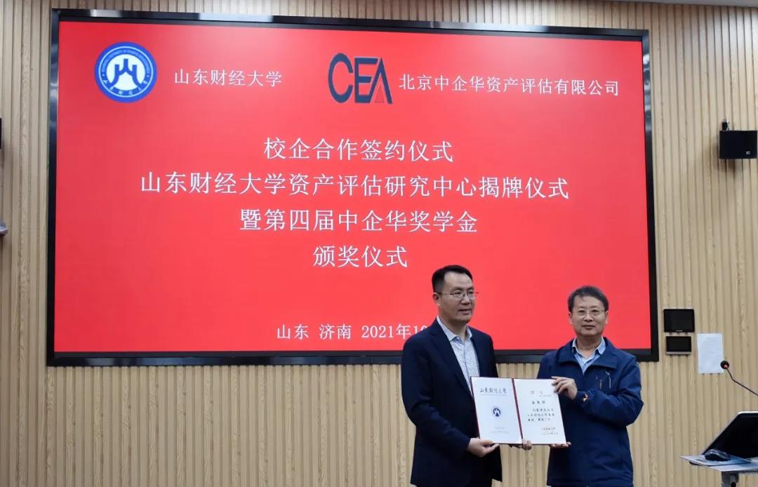 合作发展处处长、教育基金会秘书长刘奇耀和中企华山东分公司总经理尤建宏代表双方进行校企合作签约和注册送彩金 资产评估研究中心科研基金捐赠签约。注册送彩金 副院长兼注册送彩金 MPACC中心主任朱德胜宣读第四届中企华奖学金获奖学生名单,北京中企华资产评估有限责任公司领导为30名获奖学生颁奖。一等奖学金获得者资产评估2019级1班景垠乔同学代表获奖学生发言。