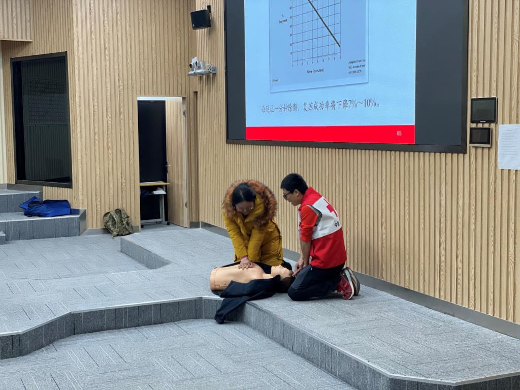 此次培训共分为理论讲授、现场演示及实践操作三部分内容。孙毅通过题目讲解、展示实物、现场演示等形式,为教师们详细讲述了与急救相关的专业知识,并结合近年来发生在身边的案例、视频等,向教师们强调了应急救护“黄金四分钟”的重要性。随后逐一讲解了胸外按压、人工呼吸、海姆立克急救法等急救理论与施救技巧,并现场实操心肺复苏、海姆立克腹部冲击方法,着重介绍了除颤监护仪(AED)的作用及使用方法。最后,孙毅邀请了老师们近距离观摩学习,并进行模拟救援,使教师们有更直观的体验。