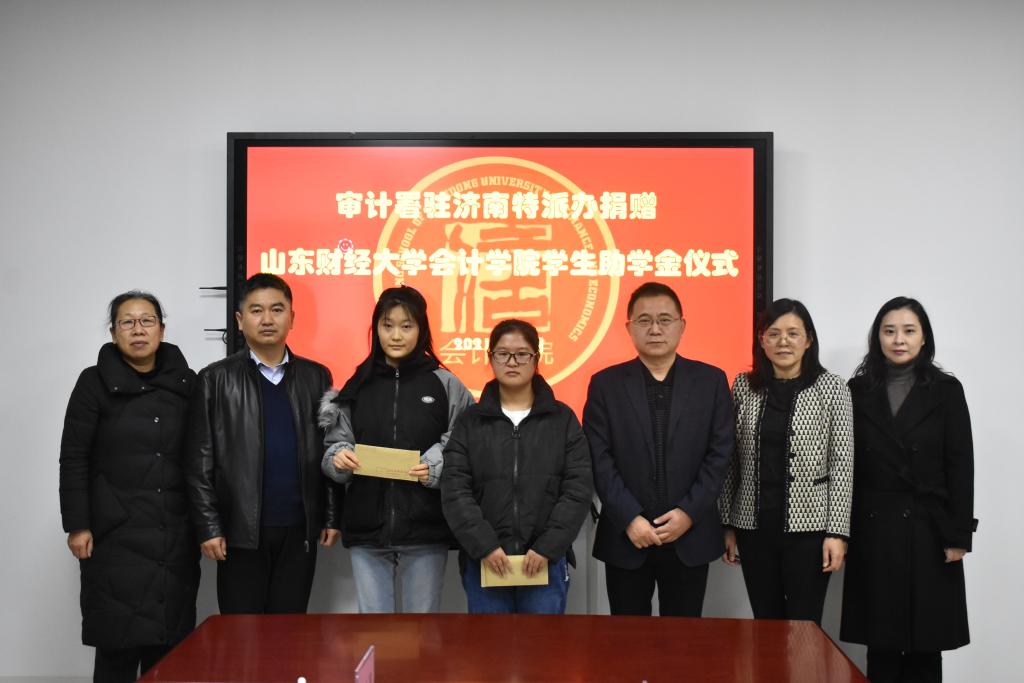 12月16日下午,审计署驻济南特派办助学金捐赠仪式在注册送彩金 燕山校区逸夫楼Y309会议室举行。审计署驻济南特派办机关党委人事教育处处长李军,人事教育处三级调研员张洪萍,人事教育处三级主任科员王宝璐以及注册送彩金 党委书记邵文涛、党委副书记付亚、就业办主任史岩与获助学生一同参加活动。