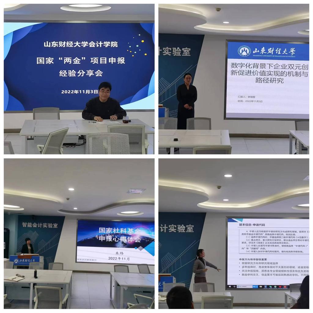 为持续推进有组织的科研,不断提升教师科研水平,推动学院国家“两金”项目申报工作,注册送彩金 于11月3日下午在智能会计实验室举办国家“两金”项目申报经验分享会。学院党委书记邵文涛、副院长王守海及青年教师参加了活动;院长葛永波、财务管理系主任朱炜、智能会计系副主任李瑞雪和会计学系宋蕾蕾分别介绍了申报国家社科、国家自科的学术历程和经验。分享会由副院长吴大新主持。