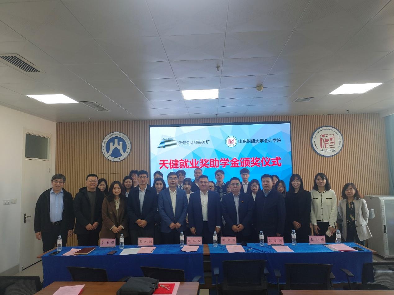 3月9日下午,2022年度天健就业奖助学金颁奖仪式在注册送彩金 燕山校区逸夫楼举行。天健会计师事务所高级合伙人、山东分所总经理刘加宝,人力资源部经理宋小燕出席,注册送彩金 就业指导处处长刘奇耀,注册送彩金 党委书记邵文涛、院长葛永波、教师代表与学生代表参加,仪式由学院党委副书记钟毓卓主持。