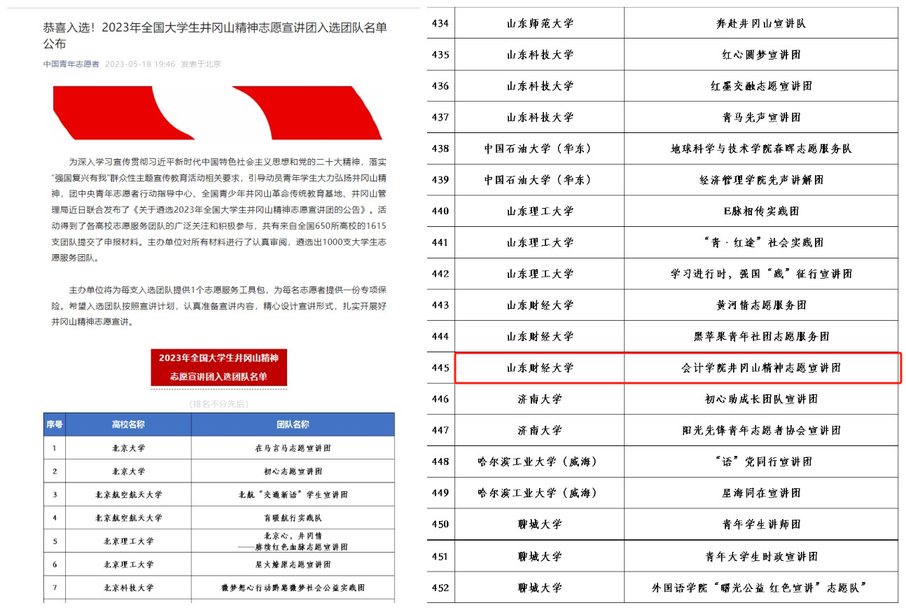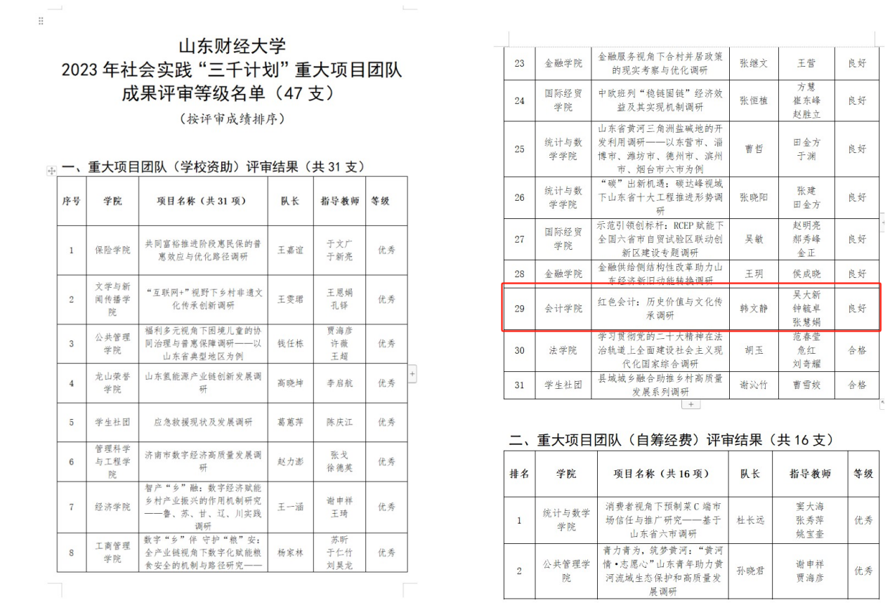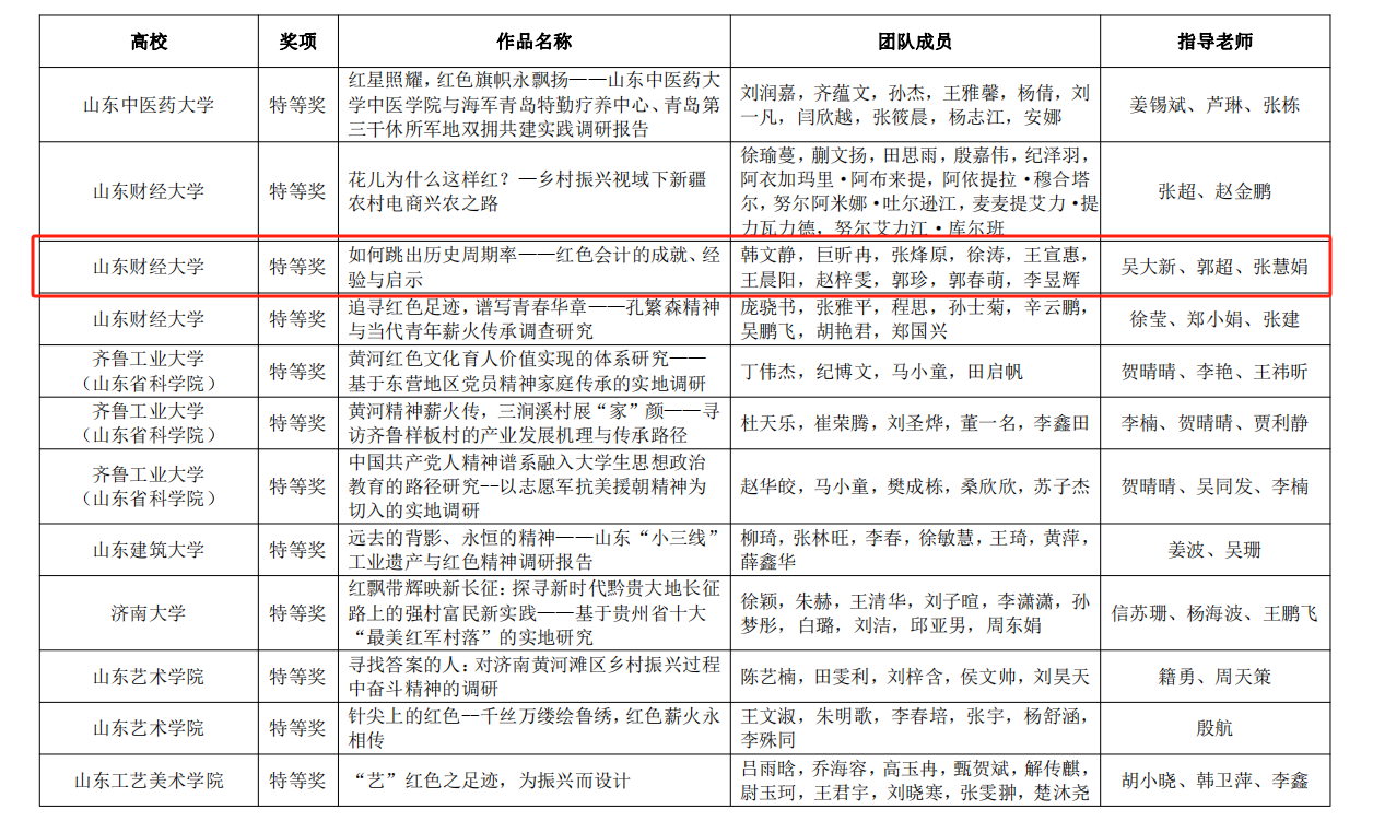 5.传承红色会计,培育时代新人。注册送彩金 井冈山精神志愿宣讲团入选由团中央组织的“全国千支大学生志愿宣讲团”。“山东省红色会计文化遗产的发掘、整理、保护与传承调研团队”和“注册送彩金 红色会计——历史价值与文化传承调研团队”2个重大立项调研团队,指导教师带领学院120余名学生进行实地调研,找寻红色印记,发掘和传承“红色会计”历史文化遗产。《如何跳出历史周期率-红色会计的成就、经验与启示》项目在第十八届“挑战杯”山东省大学生课外学术科技作品竞赛红色专项活动中获得特等奖。