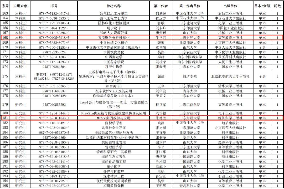 6.学院历来重视教材建设,努力建设一批高质量、有特色的高水平教材。学院《财务管理》和《基础会计》分别被评为“十二五”和“十三五”国家级规划教材,同时也是山东省第一批省级一流教材。《智能财务分析可视化》和《Mpacc案例教学与应用》被认定为山东省第二批省级一流教材,目前学院省级一流教材建设方面位列全校第一。