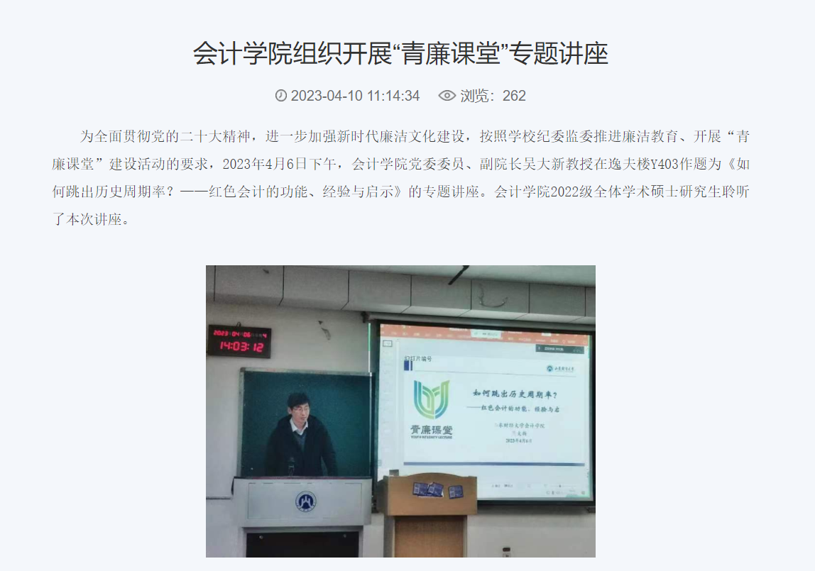 4.加强宣传工作和意识形态阵地管控。本年度注册送彩金新闻 在注册送彩金 网站院系动态栏目发文28篇,财大要闻栏目发文5篇,学习强国发文2篇,光明日报发文1篇。