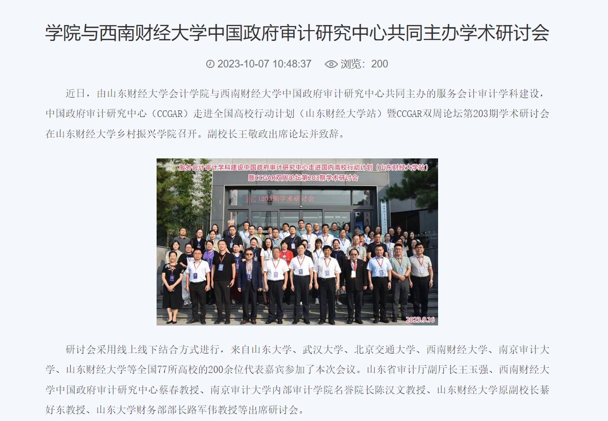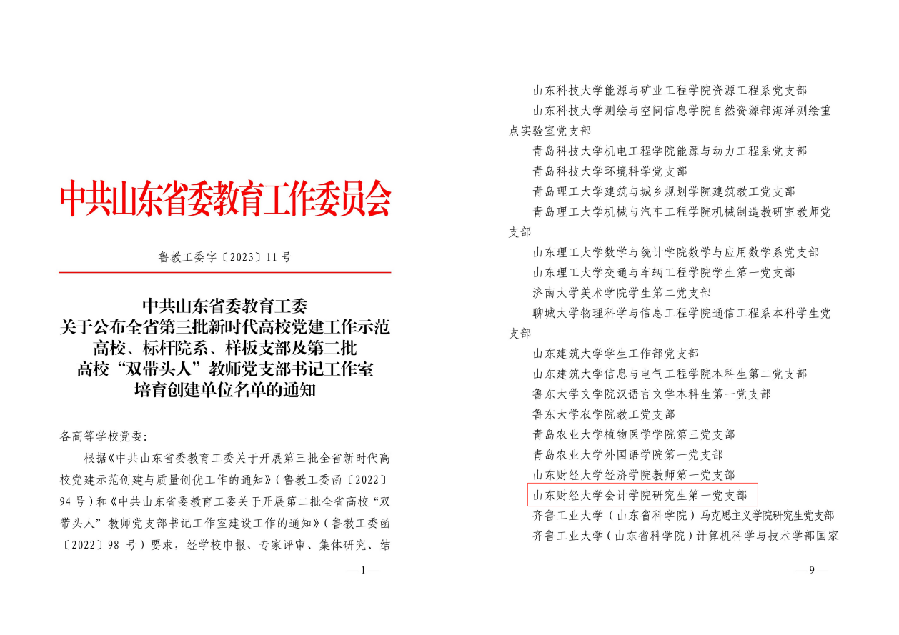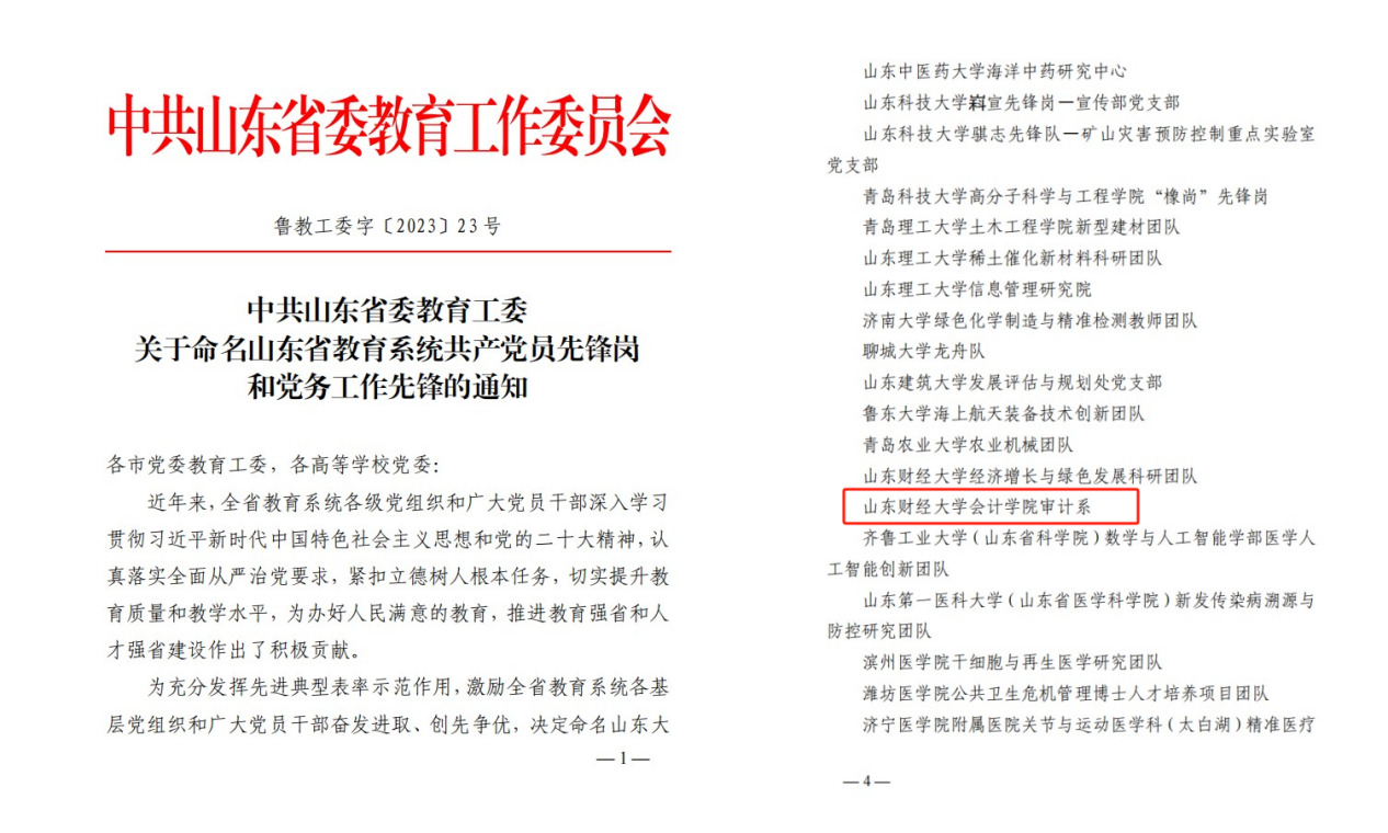 1.发挥党建引领作用。增强基层党组织政治功能和组织功能,持续推进红色会计的挖掘和研究,打造红色会计“特色党建品牌”;2023年8月,注册送彩金 研究生第一党支部获批山东省第三批新时代高校党建工作样板支部培育创建单位,10月注册送彩金 审计系获评山东省教育系统共产党员先锋岗。