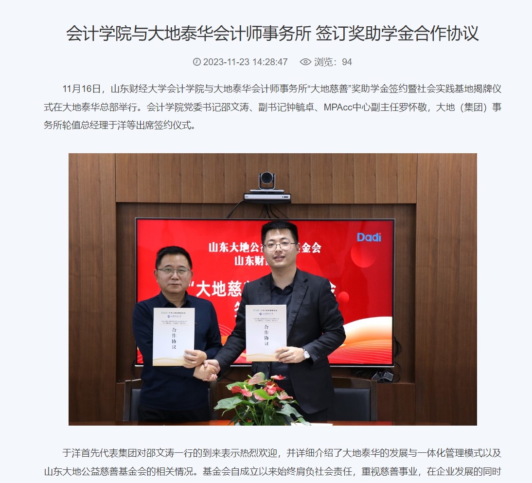 主动对接服务黄河重大国家战略和我省绿色低碳高质量发展先行区建设计划,2023年承接大中型企业和行政事业单位委托的财务、审计业务人员专业培训服务共5项;深化校地校企合作,强化产学研深度融合,与玖相云智(山东)科技服务公司、大地泰华会计师事务所签署社会实践基地、产学研合作、奖助学金协议。在山东省财政厅主持的山东省高端会计人才培养项目(学术类第二期)选拔中,注册送彩金 有5名教师入选。