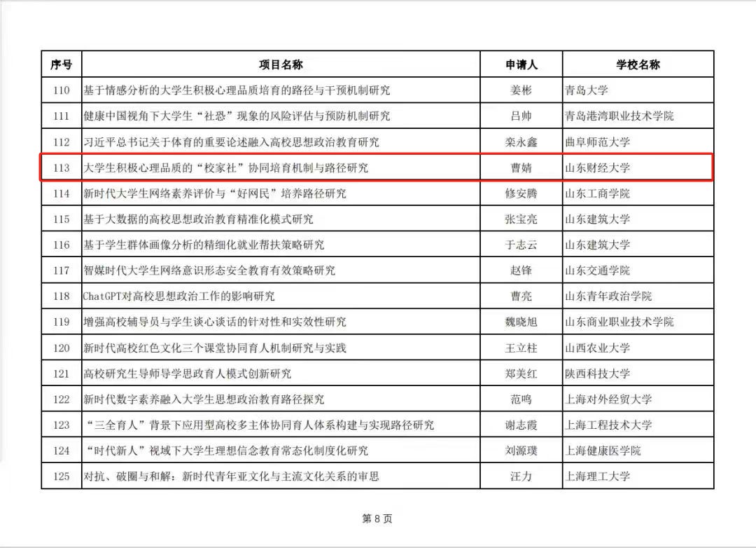 3.科研创新能力不断提升。2023年学院国家级、省部级课题获准立项15项,其中包括:国家社会科学基金重点项目1项、教育部人文社科项目1项(思政专项)、山东省社科规划研究项目4项(含重点项目1项)、山东省自科项目6项、山东省重点研发计划(软科学)项目2项(含重点项目1项)、省部共建项目1项。