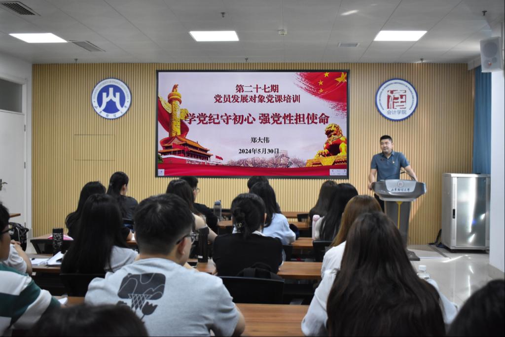 为深入推进党纪学习教育,提高入党积极分子、党员发展对象的纪律意识和党性修养,严把党员发展“入口关”和“质量关”,注册送彩金 党委副书记郑大伟在逸夫楼410为学院第二十七期党员发展对象讲授《学党纪守初心 强党性担使命》专题党课,学院党委组织员、学生第二党支部书记张沫在圣井校区6216教室为本科生入党申请人、入党积极分子、党员发展对象讲授《做党纪的学习者 践行者 担当者》专题党课。