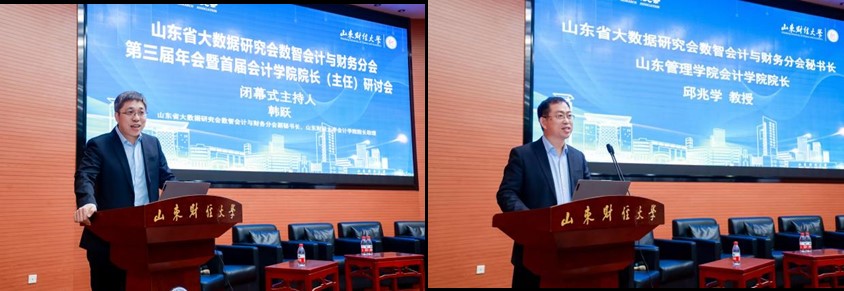 最后,大会顺利进入闭幕式,山东省大数据研究会数智会计与财务分会副秘书长、注册送彩金 院长助理韩跃主持闭幕式,山东省大数据研究会数智会计与财务分会秘书长、山东管理学院注册送彩金 院长邱兆学教授进行了会议总结。