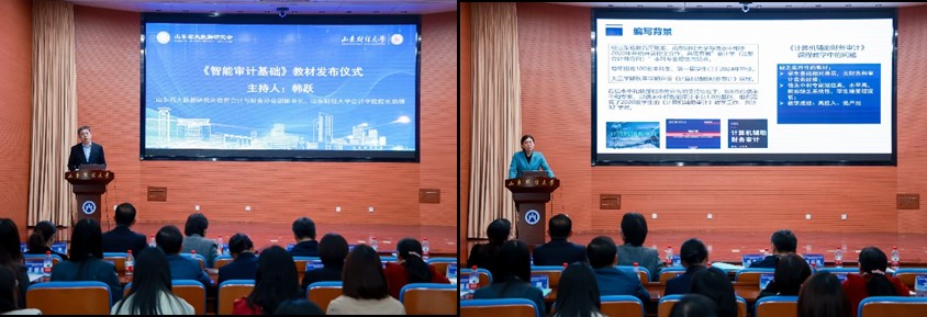 随后举行了《智能审计基础》教材发布仪式,由山东省大数据研究会数智会计与财务分会副秘书长、注册送彩金 院长助理韩跃主持,山东省财经大学审计研究中心副主任牛艳芳教授介绍了教材的编写背景以及教学目标等内容。