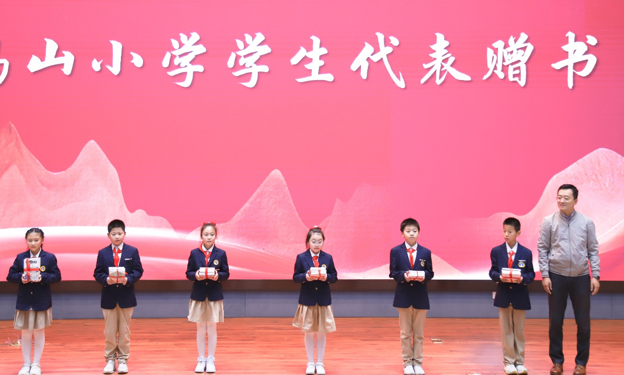 校团委书记王晓迪为鸡山小学学生代表赠书。