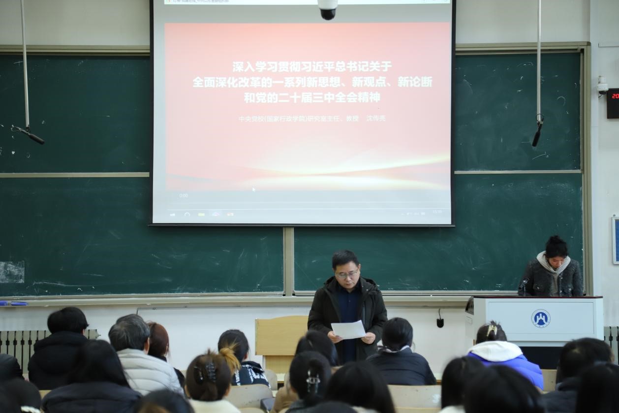 随后,邵文涛传达学校《关于开展科级及以下干部、党员学习贯彻党的二十届三中全会精神培训的通知》精神,按照《注册送彩金 关于开展学习贯彻党的二十届三中全会精神培训工作方案》,邵文涛带领科级及以下干部、党员深入学习习近平总书记关于全面深化改革的一系列新思想、新观点、新论断和党的二十届三中全会精神,并集体观看了教学视频。他强调要深刻领会党的二十届三中全会精神,把握习近平法治思想的核心要义、丰富内涵和实践要求,切实把科学思想转化为法治建设的实际成效,不断应用到教学科研和日常生活中,形成学习贯彻习近平法治思想的浓厚氛围,努力推动习近平法治思想深入人心。