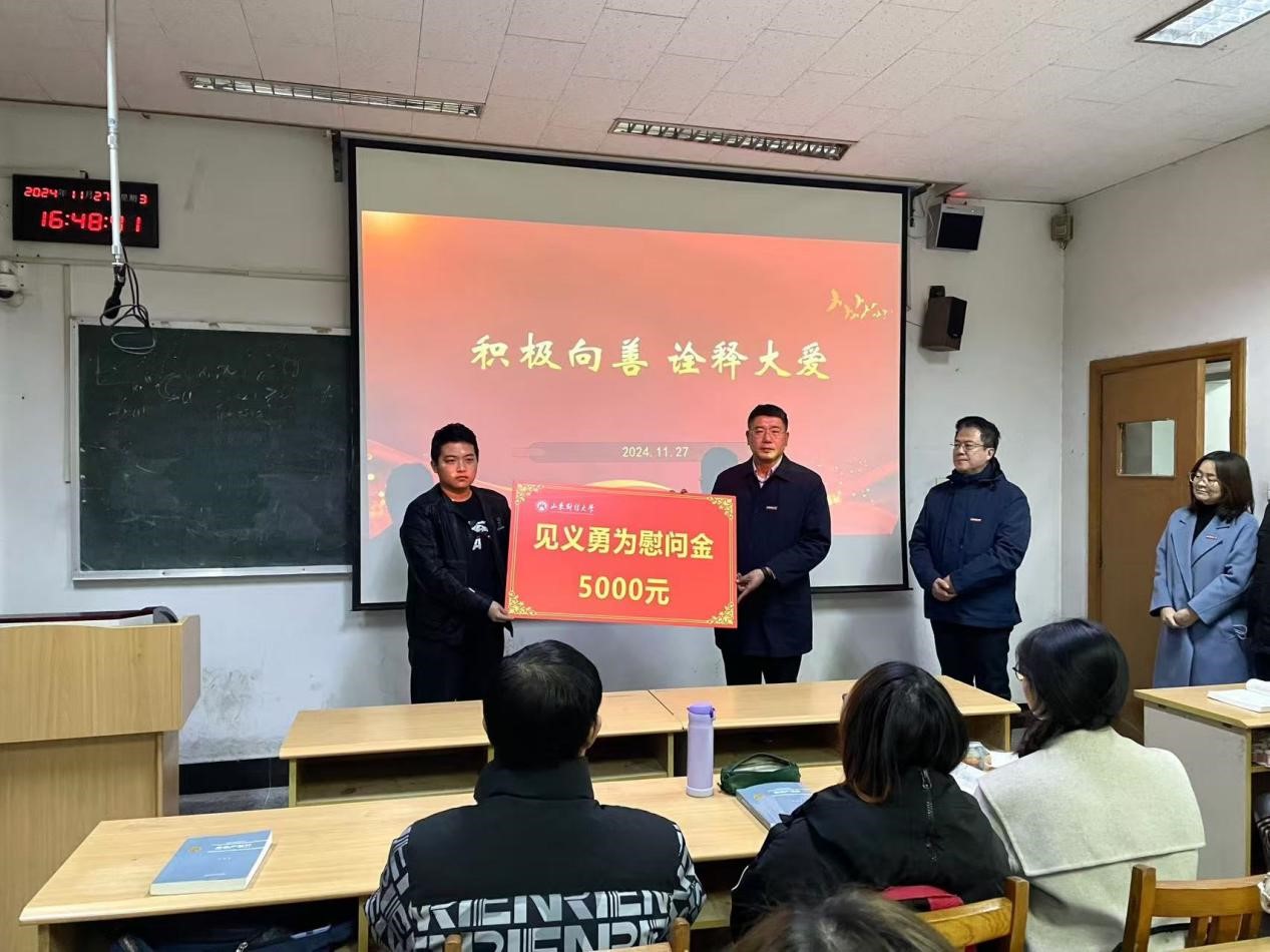 刘旻航代表学校为闫建松颁发慰问金;杨哲为闫建松送上慰问品。