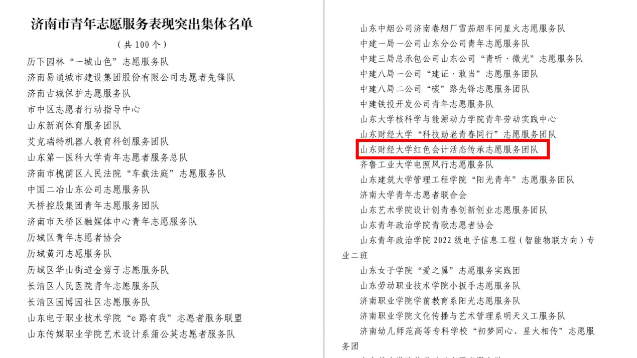 近日,共青团济南市委发文对2024年度济南市共青团工作中表现突出的集体和个人进行表彰,注册送彩金 “红色会计活态传承志愿服务团队”获评济南市青年志愿服务表现突出集体。