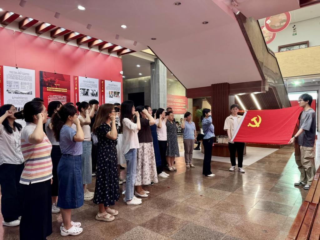 参观结束后,学院党委副书记吕晓燕带领全体师生党员重温入党誓词。全体党员面对鲜红的党旗,庄严举起右拳,在铮铮誓言中回溯入党初心,唤醒那份最初的信仰与热忱,完成对自己初心的致敬和对党的深情礼赞,也在誓言中汲取精神力量,坚定砥砺前行的信念。
