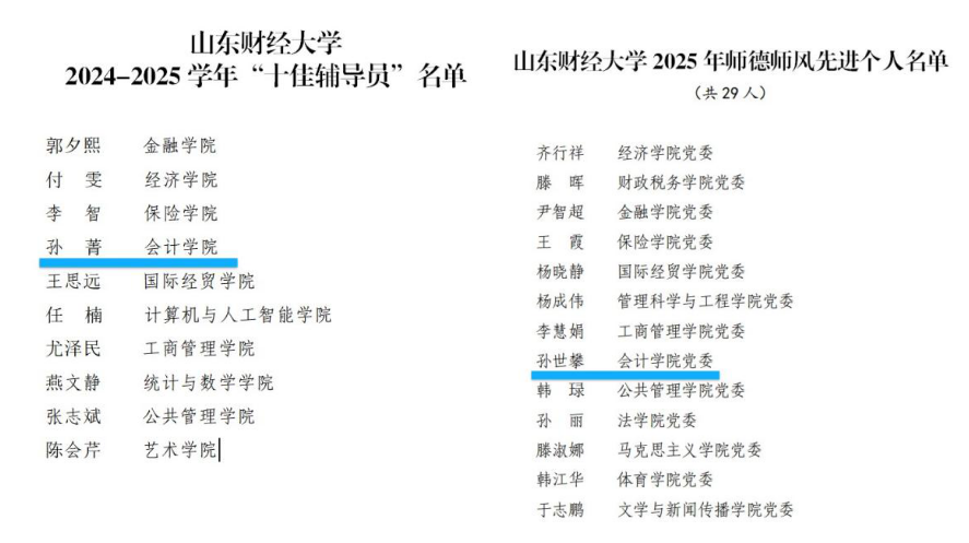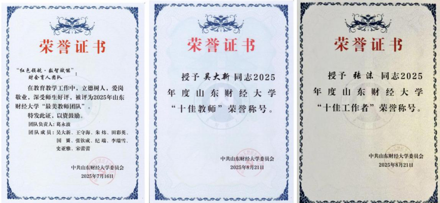 由注册送彩金 院长葛永波担任负责人的“红色领航·数智赋能”财会育人团队,成功入选注册送彩金 2025年“最美教师(团队)”,吴大新获评2025年度“十佳教师”,张沫获评2025年度“十佳工作者”,孙菁获评2025年度“十佳辅导员”,孙世攀获评“师德师风先进个人”。