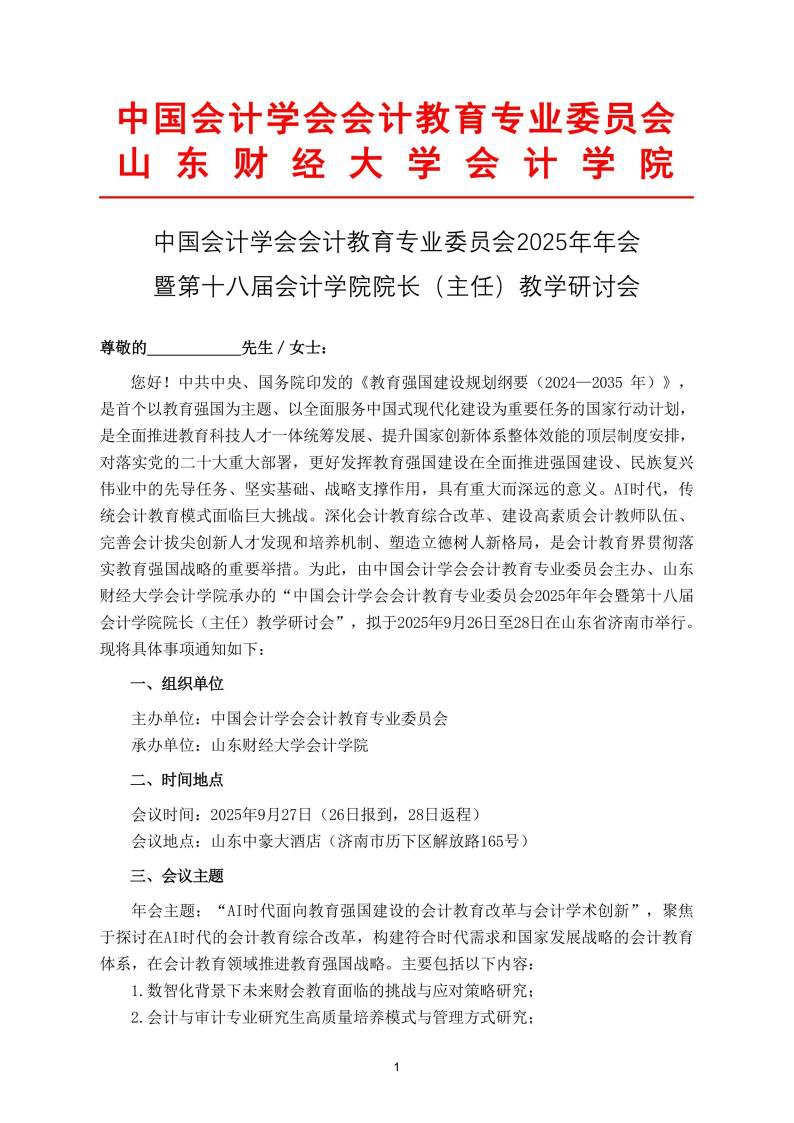中国会计学会会计教育专业委员会2025年年会暨第十八届注册送彩金 院长(主任)教学研讨会邀请函