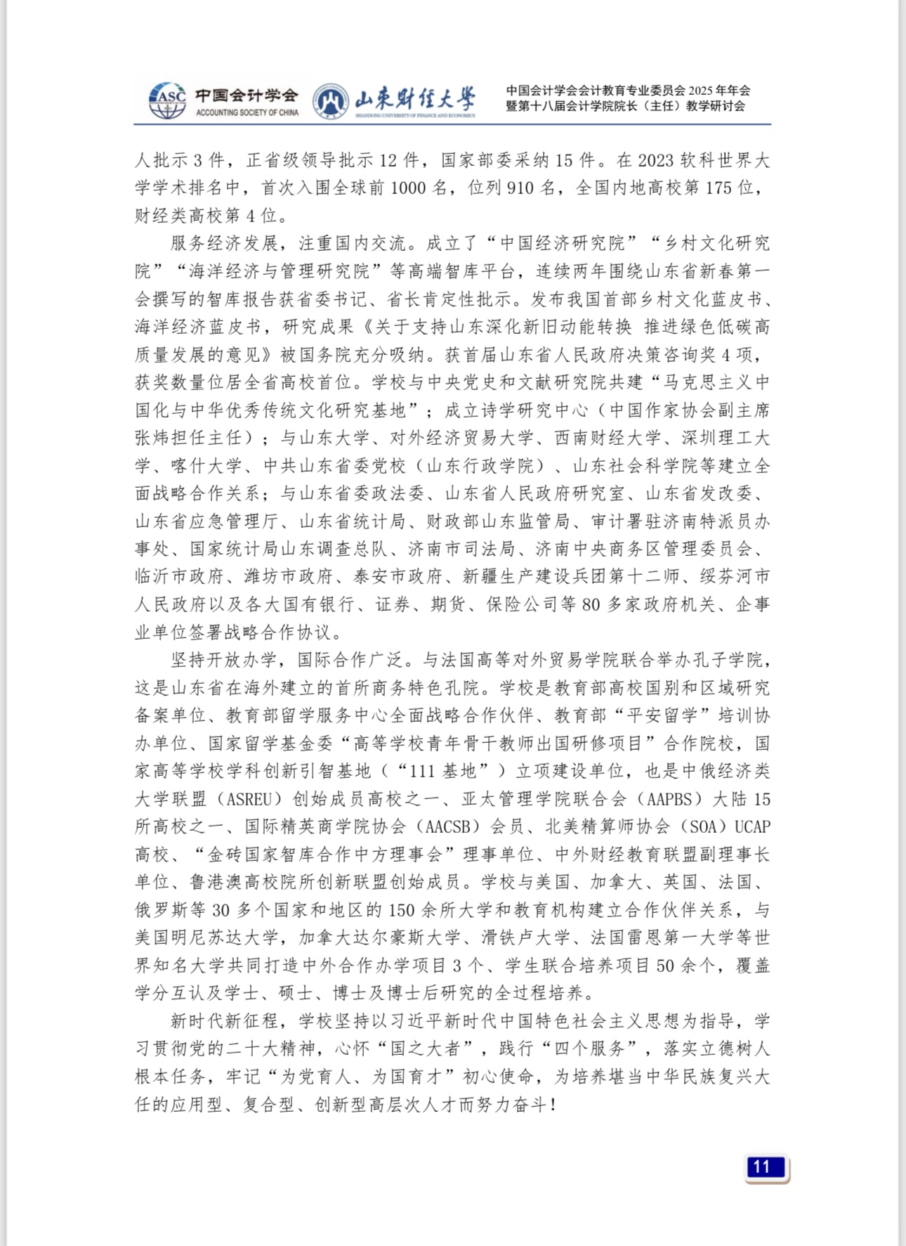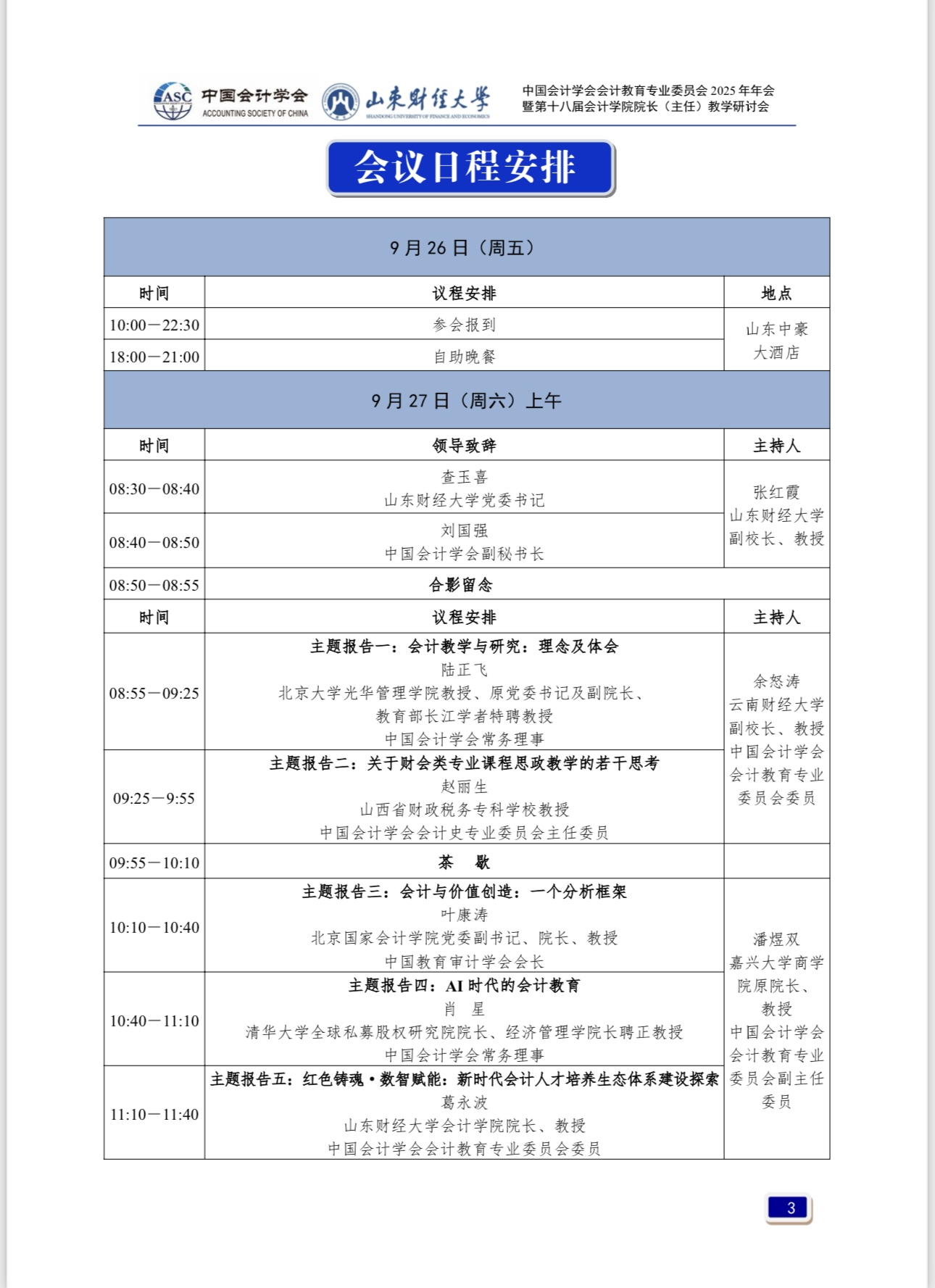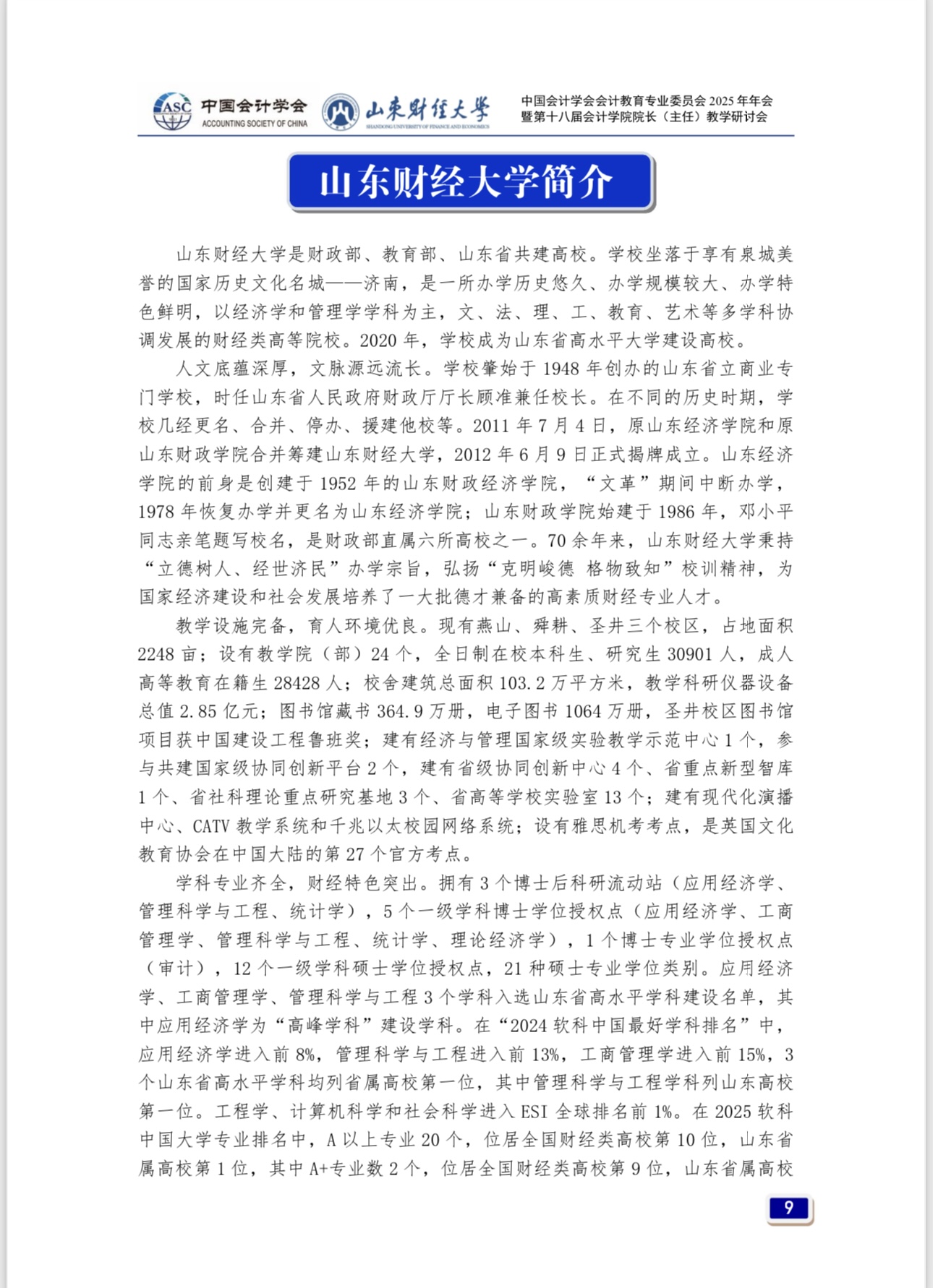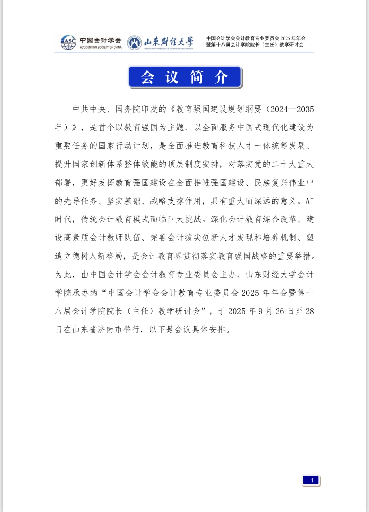 中共中央、国务院印发的《教育强国建设规划纲要(2024—2035 年)》,是首个以教育强国为主题、以全面服务中国式现代化建设为重要任务的国家行动计划,是全面推进教育科技人才一体统筹发展、提升国家创新体系整体效能的顶层制度安排,对落实党的二十大重大部署,更好发挥教育强国建设在全面推进强国建设、民族复兴伟业中的先导任务、坚实基础、战略支撑作用,具有重大而深远的意义。AI时代,传统会计教育模式面临巨大挑战。深化会计教育综合改革、建设高素质会计教师队伍、完善会计拔尖创新人才发现和培养机制、塑造立德树人新格局,是会计教育界贯彻落实教育强国战略的重要举措。为此,由中国会计学会会计教育专业委员会主办、注册送彩金 承办的“中国会计学会会计教育专业委员会2025年年会暨第十八届注册送彩金 院长(主任)教学研讨会”,于2025年9月26日至28日在山东省济南市举行,以下是会议具体安排。