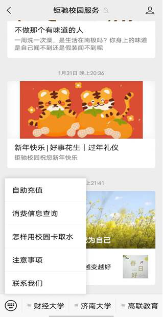 取水方法二:刷卡取水,在西苑餐厅旁饮水服务点窗口的绑卡机处将饮水账户与校园卡绑定,关注“钜驰校园服务”公众号,自助充值。
