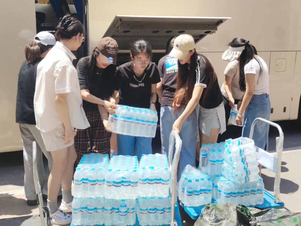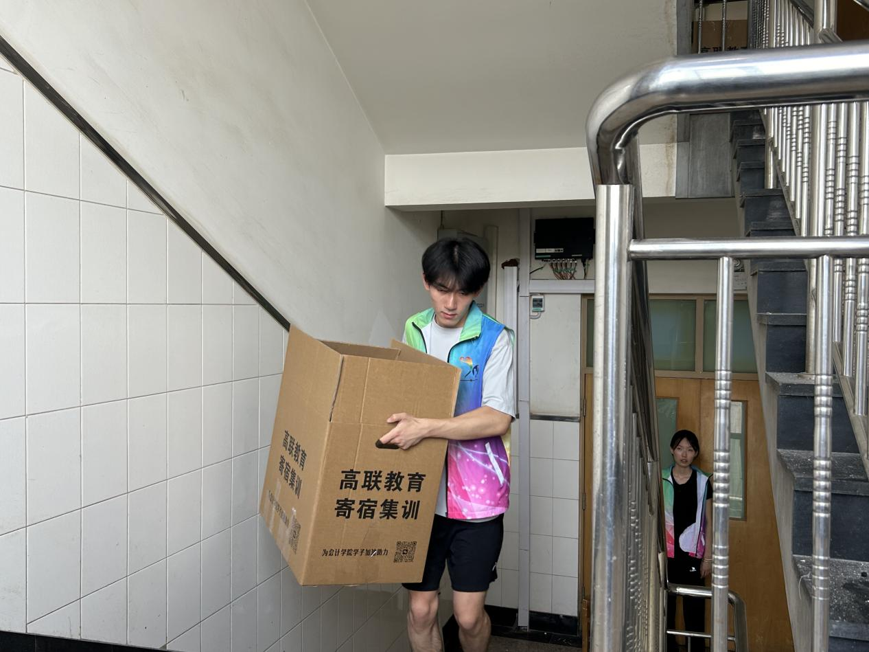 志愿者们分批上岗,提前集合后按楼层分工协作,接力搬运。尽管汗水浸透衣衫,他们仍坚持"点对点"送达指定宿舍。各点位均贴心配备了学院准备的矿泉水,志愿者们在维持着高效工作节奏的同时,也时刻关注着行李安全和同学们的需求。