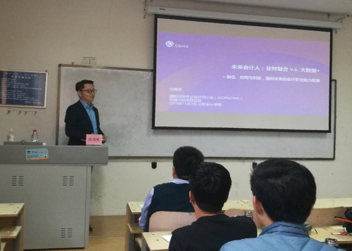2018年11月3日下午,徐国栋应注册送彩金 邀请,在燕山校区Y308教室作题为《融合、协同与创新,面向未来的财经职业能力框架》的专题报告会。注册送彩金 副院长、MPACC中心主任朱德胜出席并主持了报告,注册送彩金 部分老师以及非全日制硕士研究生参加了报告。徐国栋现任国际注册专业会计师协会(AICPAICIMA)中国大陆事务总监。