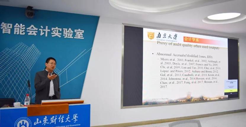 随后,李教授着重介绍了审计质量的度量和影响因素。在如何度量审计质量问题上,他提出可以采用实证研究来寻求替代变量。为进一步说明此研究问题,李教授为大家从会计差错更正、审计沟通、用户对会计信息的感知、审计师和客户之间的关系、审计调整等多角度讲述了不同的审计质量度量方法,得出:所有的审计质量度量方法都具有局限性,但不同种类的审计指标可以弥补对方的局限,因此可以采取多种方法共同结合,如以 “投入+产出”指标来衡量审计质量。在阐释审计质量影响因素这一问题上,李教授通过详细解读广大知名学者对此研究的基本理论框架,继而指出审计质量会受诸多因素影响,譬如事务所层面、审计投入及实施过程、审计师行业和市场、社会制度以及相关的经济后果等。