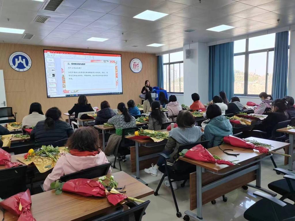 活动伊始,花艺师张秋莲老师向大家介绍了插花的相关背景,随后,张秋莲老师给大家讲解了几个日常花束养护的小窍门。如修剪花枝时需要斜切45度,保留花的最大吸水面;加入几颗vc糖有利于花更好地生长等等。同时也针对大家的养护误区进行了答疑解惑,老师们在花艺课堂中认真聆听、互相交流养花心得,现场气氛十分融洽。