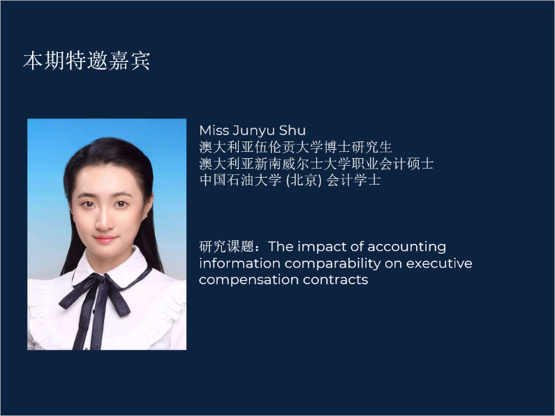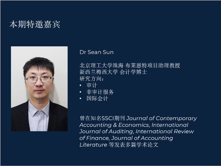 第五期主题为《实证会计理论与研究》,黄博士介绍了实证会计的起源以及实证会计的开山之作Ball & Brown(1968)发表的论文,通过引入例子向大家讲述了“How to conduct a good positive research”,为同学们指导实证论文的选题与写作。本次课程邀请到了北京理工大学珠海学院教师、会计学术联盟盟友孙翾博士(Dr Sean Sun)作《SSCI实证论文发表经验分享》。