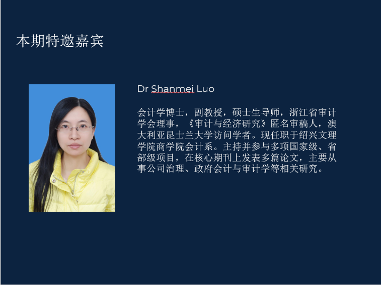 第六、七期主题分别为《阐述与批判会计研究》与《社会与环境会计研究》。在本期中,黄博士介绍了规范会计研究的意义,作为实证会计的质疑与补充,并分享了规范会计文献。针对社会与环境会计研究,黄博士介绍了组织和社会在环境和社会方面的责任和可持续发展问题,并介绍了其研究基础——合法性理论、利益相关者理论与制度理论,同时启发同学们能否用不同的理论来理解公司的行为。黄博士还邀请了绍兴文理学院教师、会计学术联盟盟友罗珊梅博士(Dr. Shanmei Luo)就审计理论研究进行了指导。