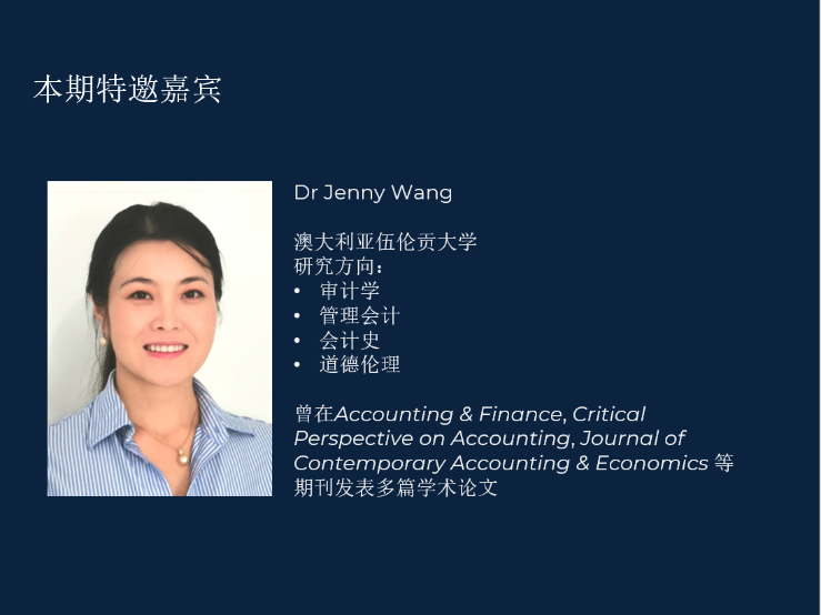 第二期主题为《会计的历史发展与演进》,黄博士和吴大新教授分别对会计史研究进行了讲解,使同学们对会计的历史演进与会计史研究方法论有了深层的认识。同时,本期黄博士邀请到了伍伦贡大学的Jenny Wang博士,与同学们分享了读博经历与论文写作心得。